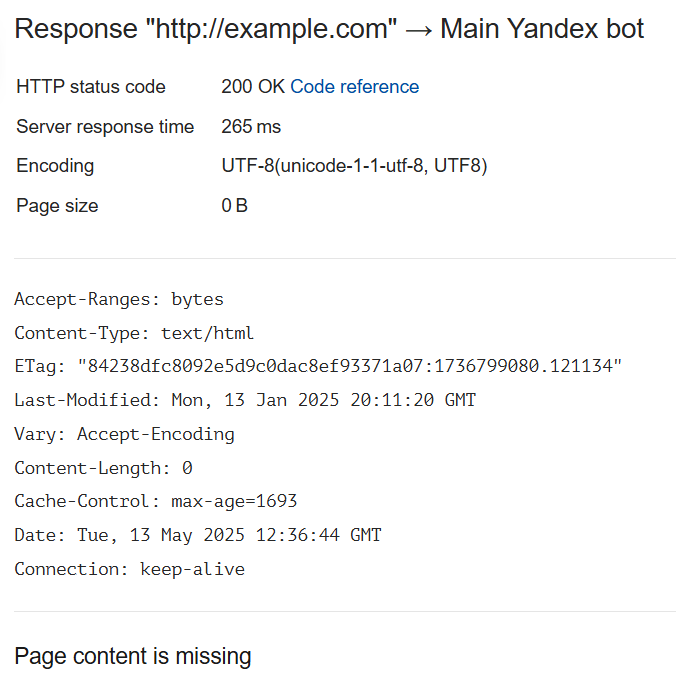 You can use the Server response check tool to find out whether the site pages are accessible to the Yandex robots, as well as other information about the site, such as the status of the SSL certificate.
