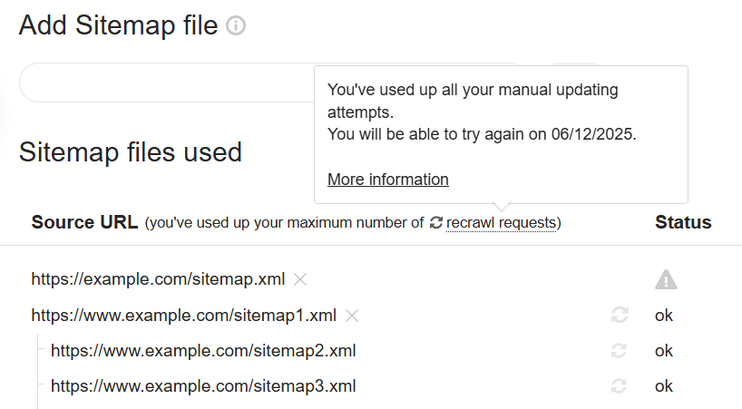 To speed up the file indexing, click the icon. If you use the Sitemap index file you can launch the processing of each file listed in it. The robot will download the data within two weeks. You can use this function up to 10 times for each host.