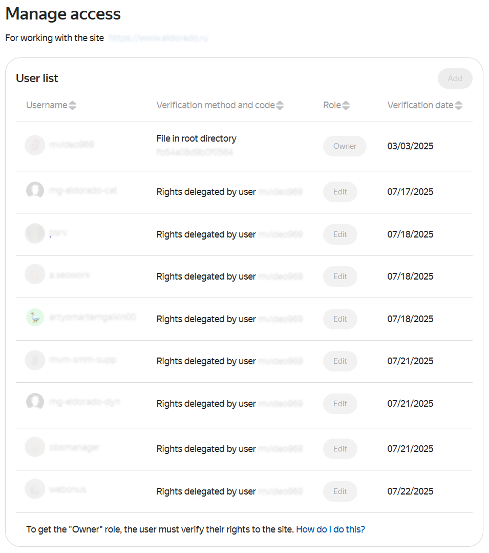 If you're the site owner or you have direct access to the site, verify your management rights in Yandex Webmaster using one of the available methods. Once site ownership is verified, you'll receive the Owner role.