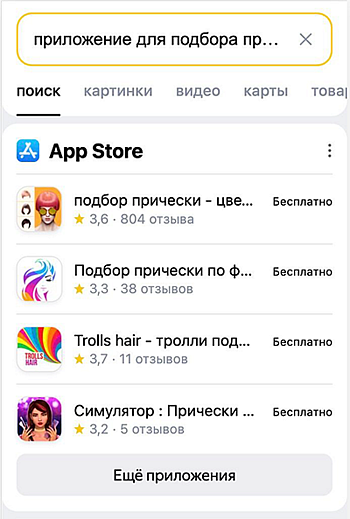 Содержит список приложений, которые подходят под поисковый запрос пользователя, в мобильной выдаче Яндекса. Пользователь может выбрать приложение из списка и перейти в магазин приложений — чтобы ознакомиться с подробной информацией и установить приложение на устройство.