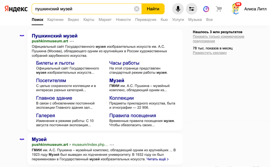 Содержит ссылки на основные разделы сайта. Отображается, когда пользователь ищет конкретный ресурс. Помогает быстро попасть в нужный раздел сайта и тем самым экономит самый ценный ресурс пользователя — время.