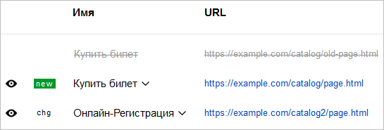 В Вебмастере удаленная ссылка зачеркнута. Если робот подобрал взамен удаленной новую ссылку, она выделяется меткой «new».