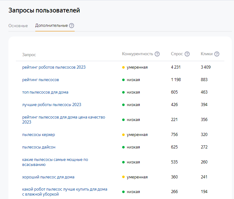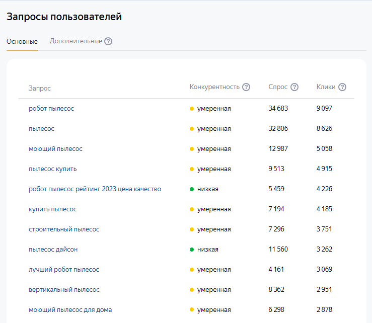 Изучите запросы на вкладке Дополнительные. Они помогут вам найти неочевидные запросы, например, «пылесос с влажной уборкой» как дополнение к запросу «моющий пылесос».