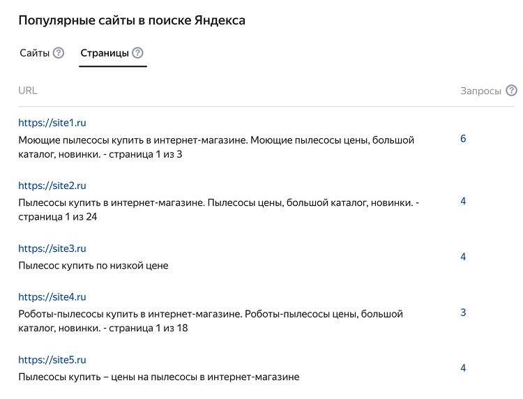 В разделе Страницы рядом с URL-адресами есть столбец Запросы. В нем показана подборка поисковых запросов, по которым страница появлялась в результатах поиска за последний месяц. Запросы разделены на основные и дополнительные. Чтобы увидеть подборку, кликните на число запросов в столбце.
