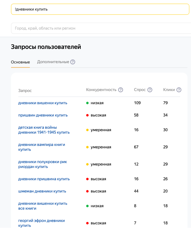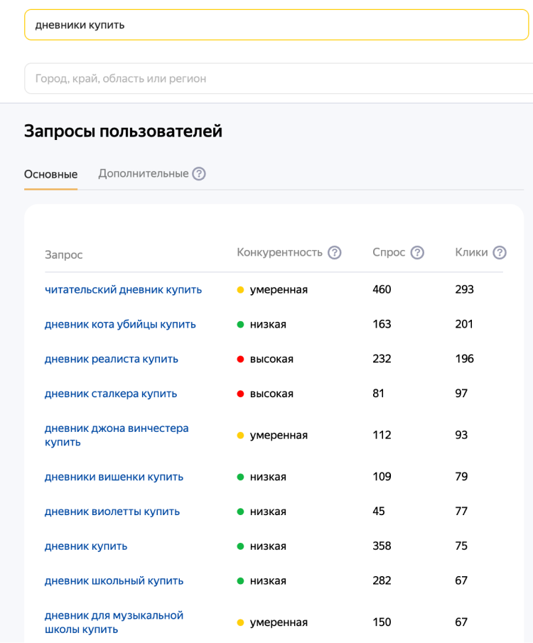 Спрос, клики и конкурентность помогут выбрать ключевые слова для оптимизации и продвижения сайта.