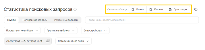 Статистика основана на результатах поисковой выдачи на любых устройствах по всем регионам. Архив содержит информацию о поисковых запросах, по которым сайт отображался последние семь дней. Для каждого запроса можно посмотреть: